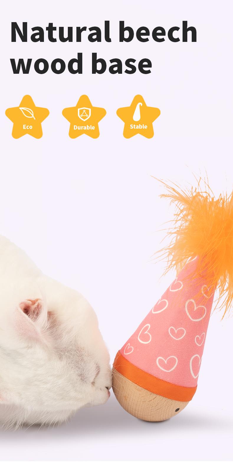 Natural Wood Wobble Cat Toy – Built-In Catnip & Feather, Durable & Interactive